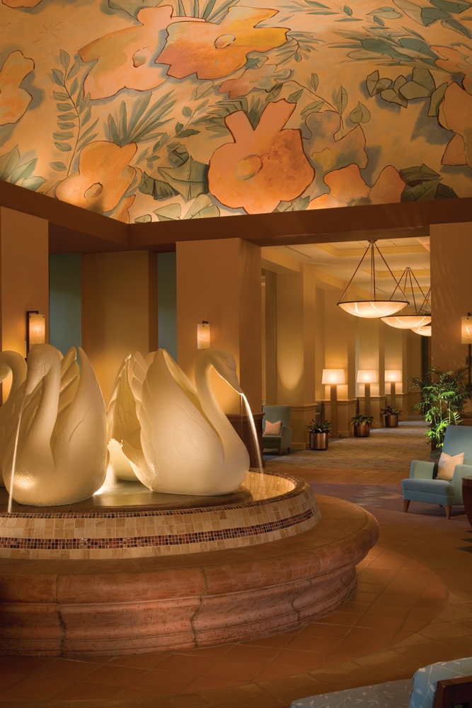 Современный тематический отель по проекту архитектора Майкла Грейвза декорирован многочисленными скульптурами и росписями.