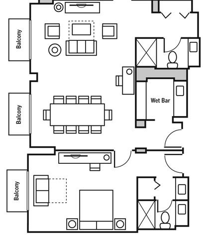 Дизайн выполнен по проекту всемирно-известного архитектора и дизайнера Майкла Грейвса, сочетает изысканность и непринужденный комфорт. Современный декор, комфортабельная мебель. Просторная гостиная с зоной отдыха и столовой может совмещаться с одной или двумя спальнями. Буфет с раковиной, обеденный стол на 6 персон.