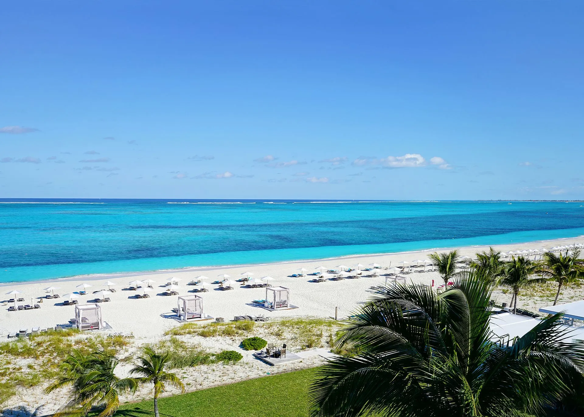 Отель стоит на лучшем пляже острова – Grace Bay. Имеет свой довольно большой участок, оборудованный шезлонгами, зонтами и двойными кушетками для отдыха в первой линии.